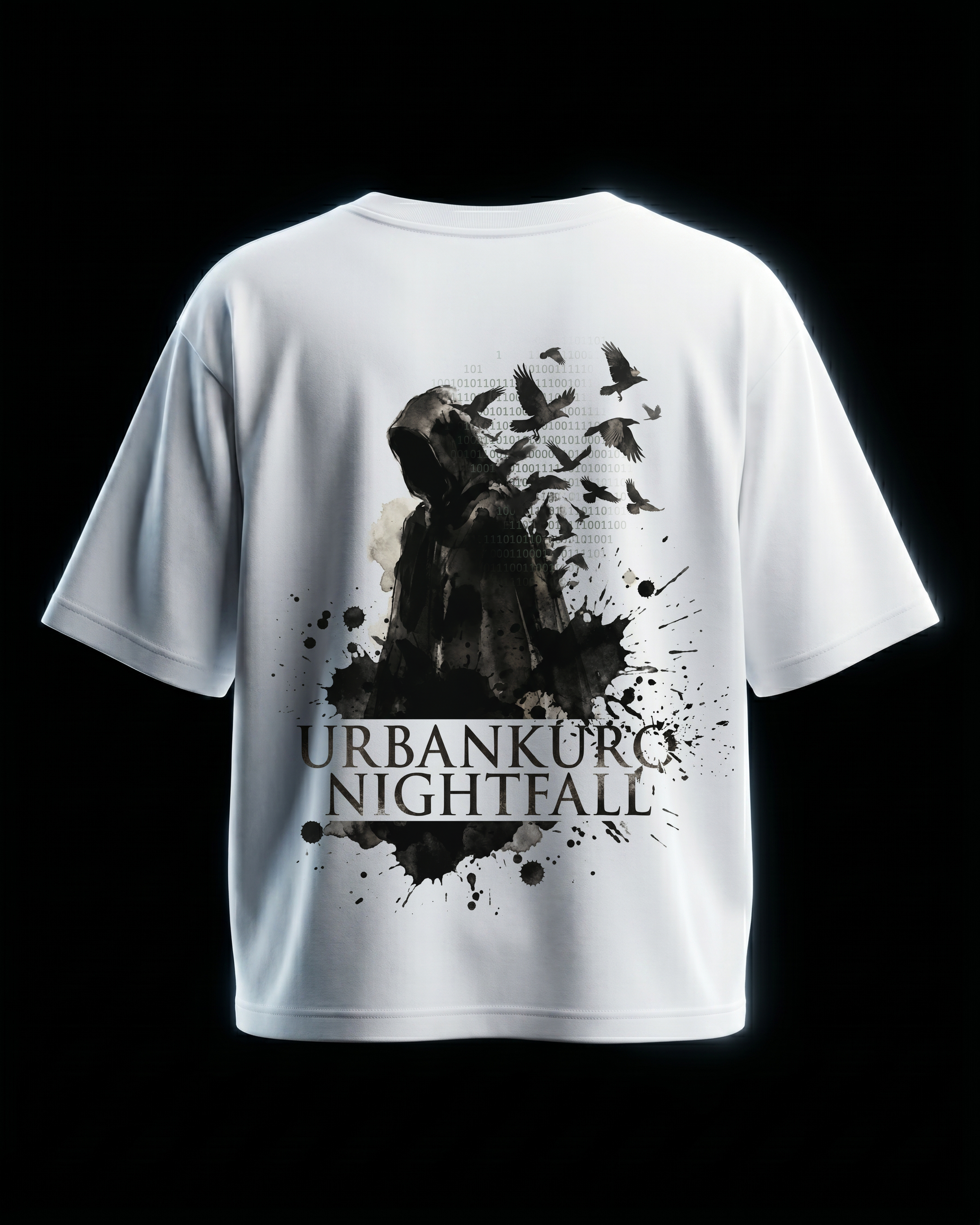 Dark streetwear aesthetic featuring a hooded figure surrounded by crows in a sprawling city setting. 240GSM heavyweight fabric, extreme drop shoulders.