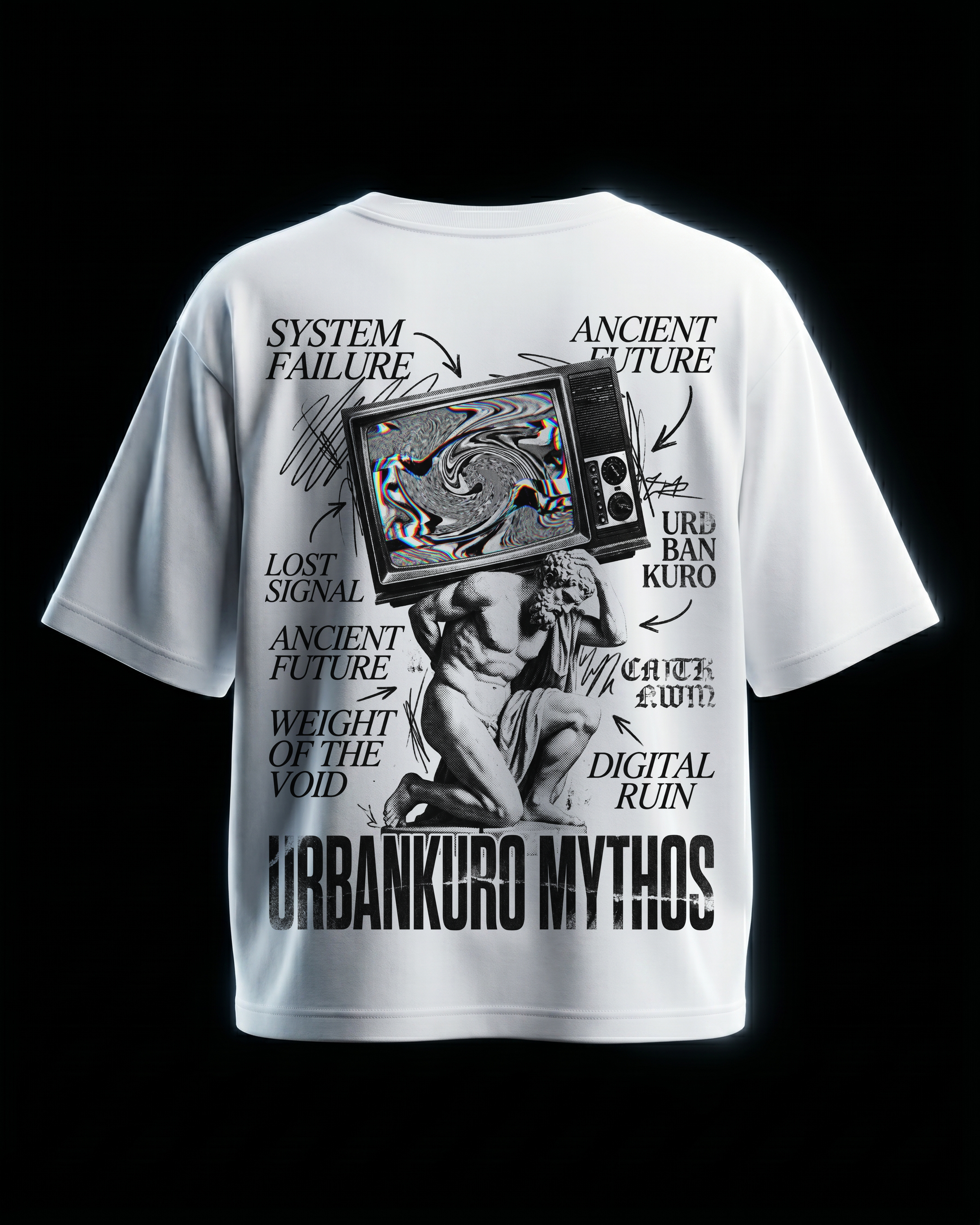 Classical Greek statue head featuring bold 'URBANKURO' typography with red glitch tech blocks. Premium 240GSM heavyweight oversized tee. DTG printed for zero-crack durability.