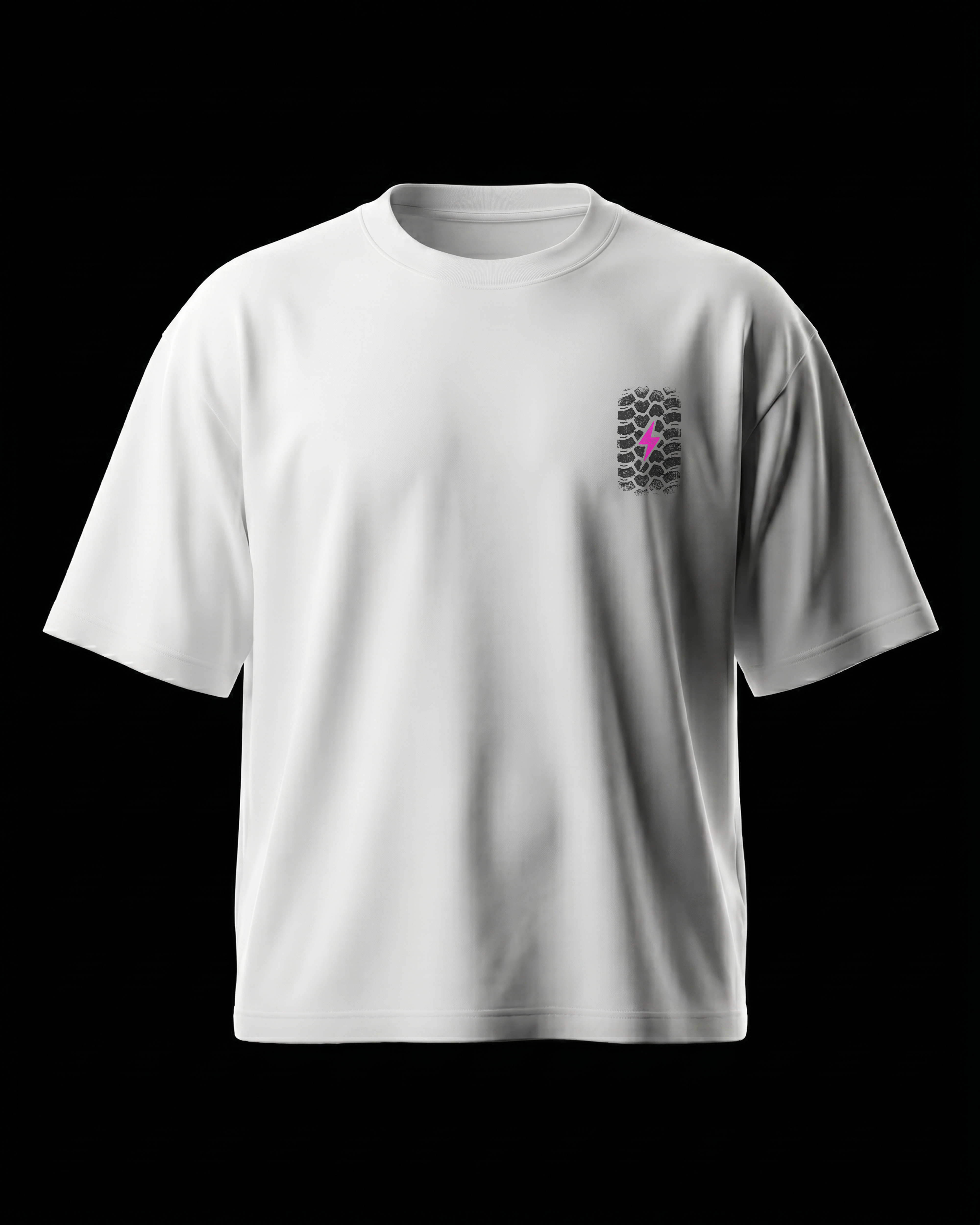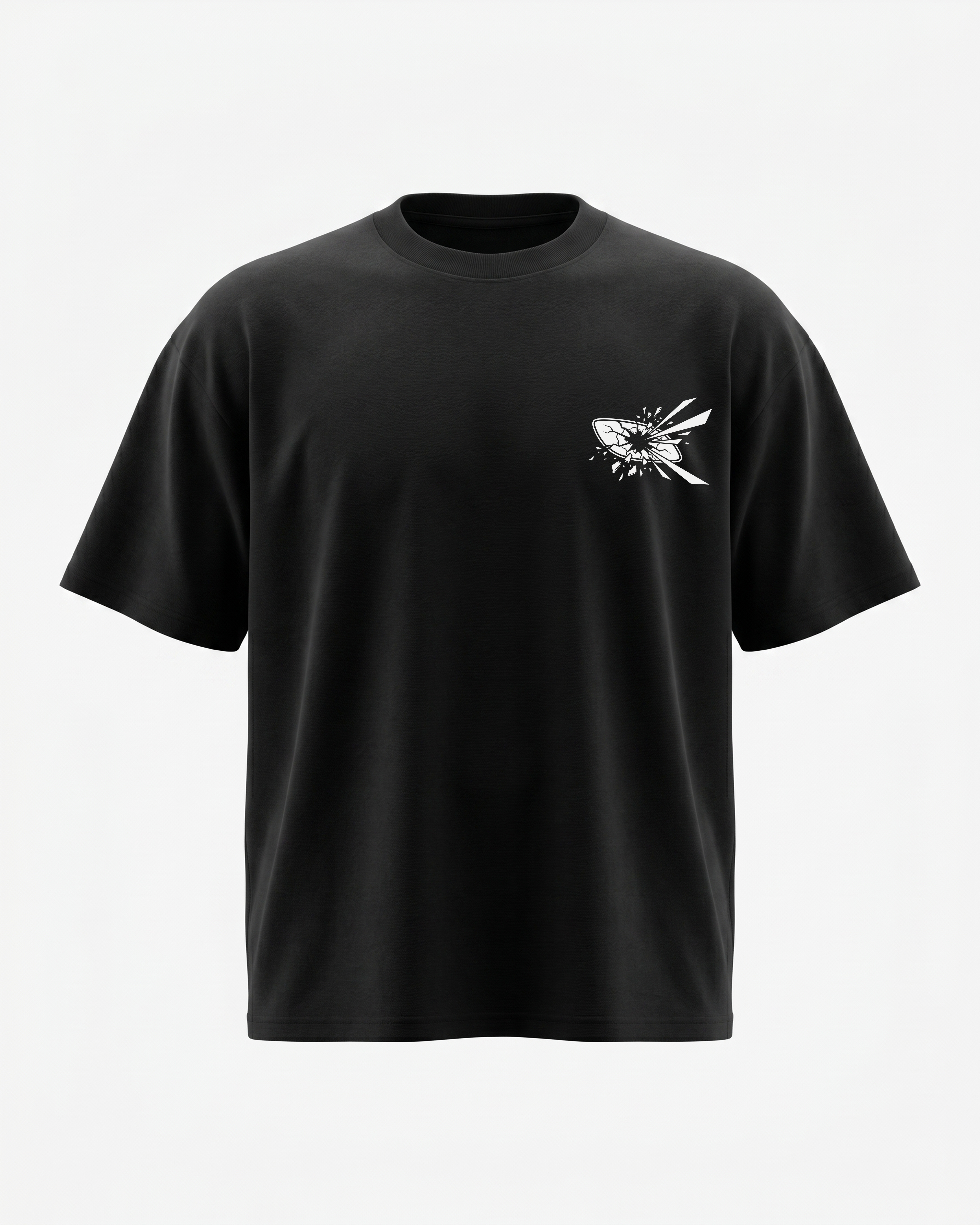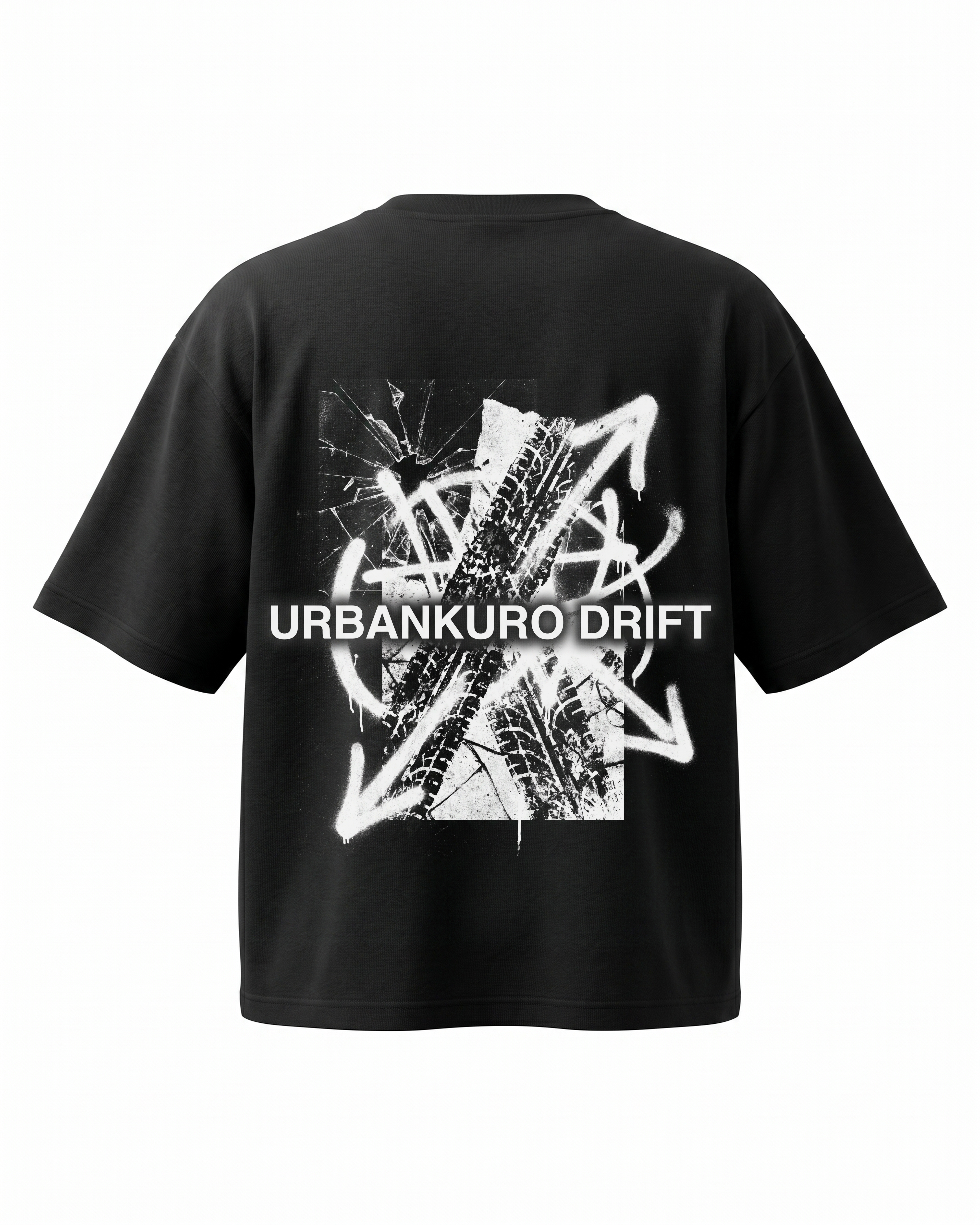Distorted tire tracks, directional arrows, and shattered glass effects capturing the drift culture. 240GSM heavyweight oversized tee. DTG printed.
