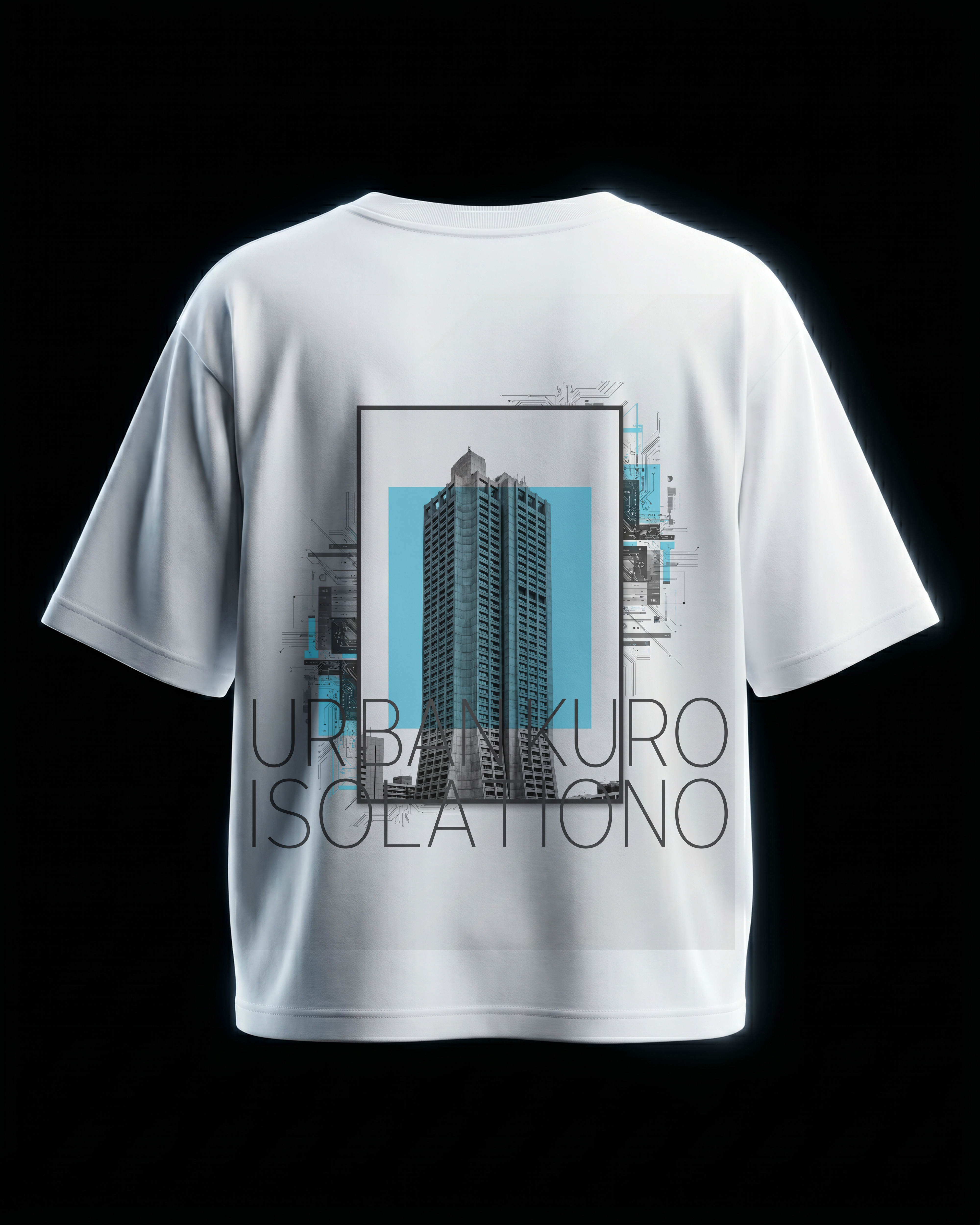 A towering cyberpunk skyscraper set against a vivid blue sky frame. 240GSM premium cotton, oversized boxy fit. Museum-grade DTG print quality.