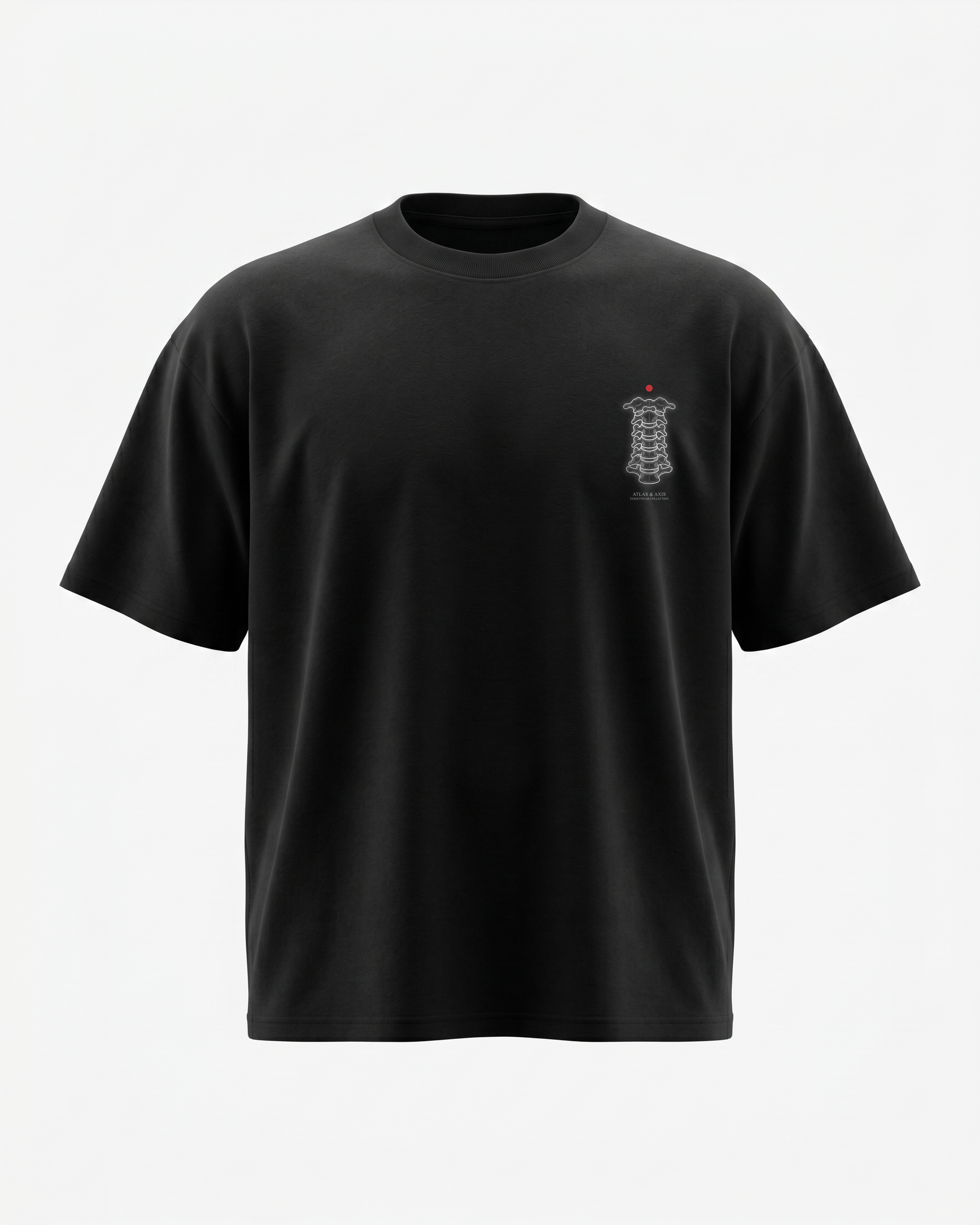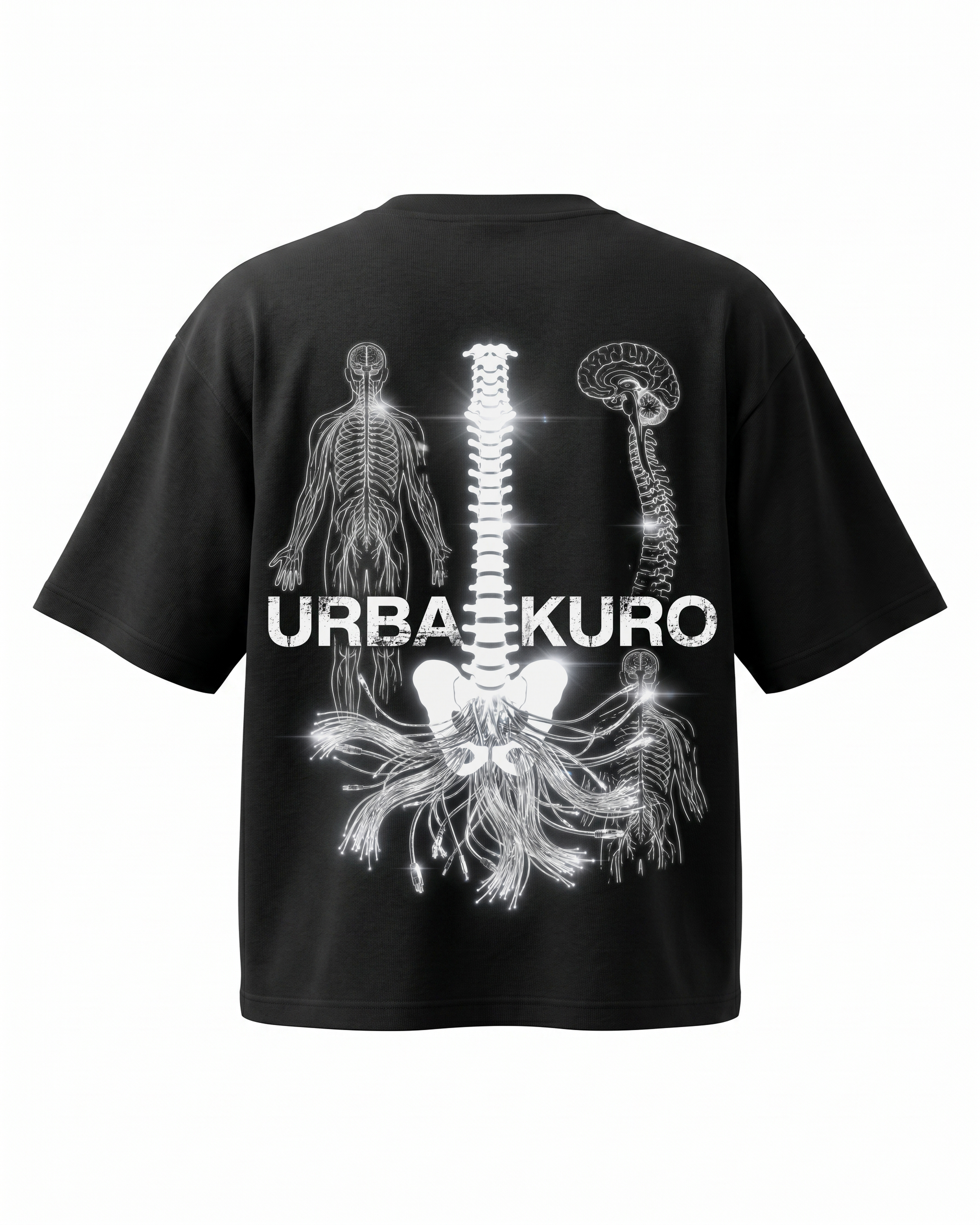 A glowing skeletal spine column rendered in brilliant white and blue neon tones. 240GSM heavyweight oversized tee. DTG printed for high-contrast detail.