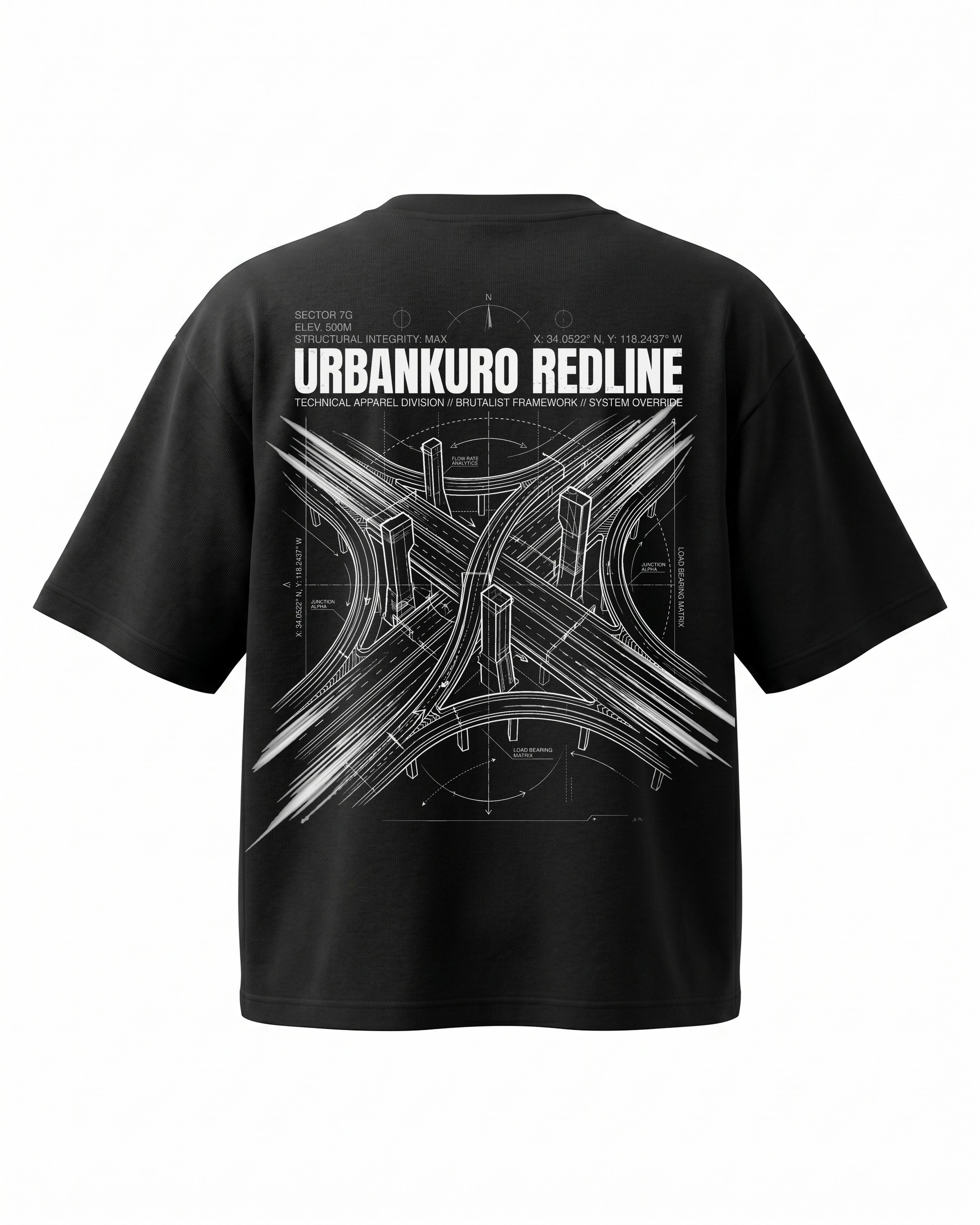 Abstract Redline highway intersection blueprint and aerial view geometry. 240GSM heavyweight cotton, oversized fit. Understated industrial luxury.
