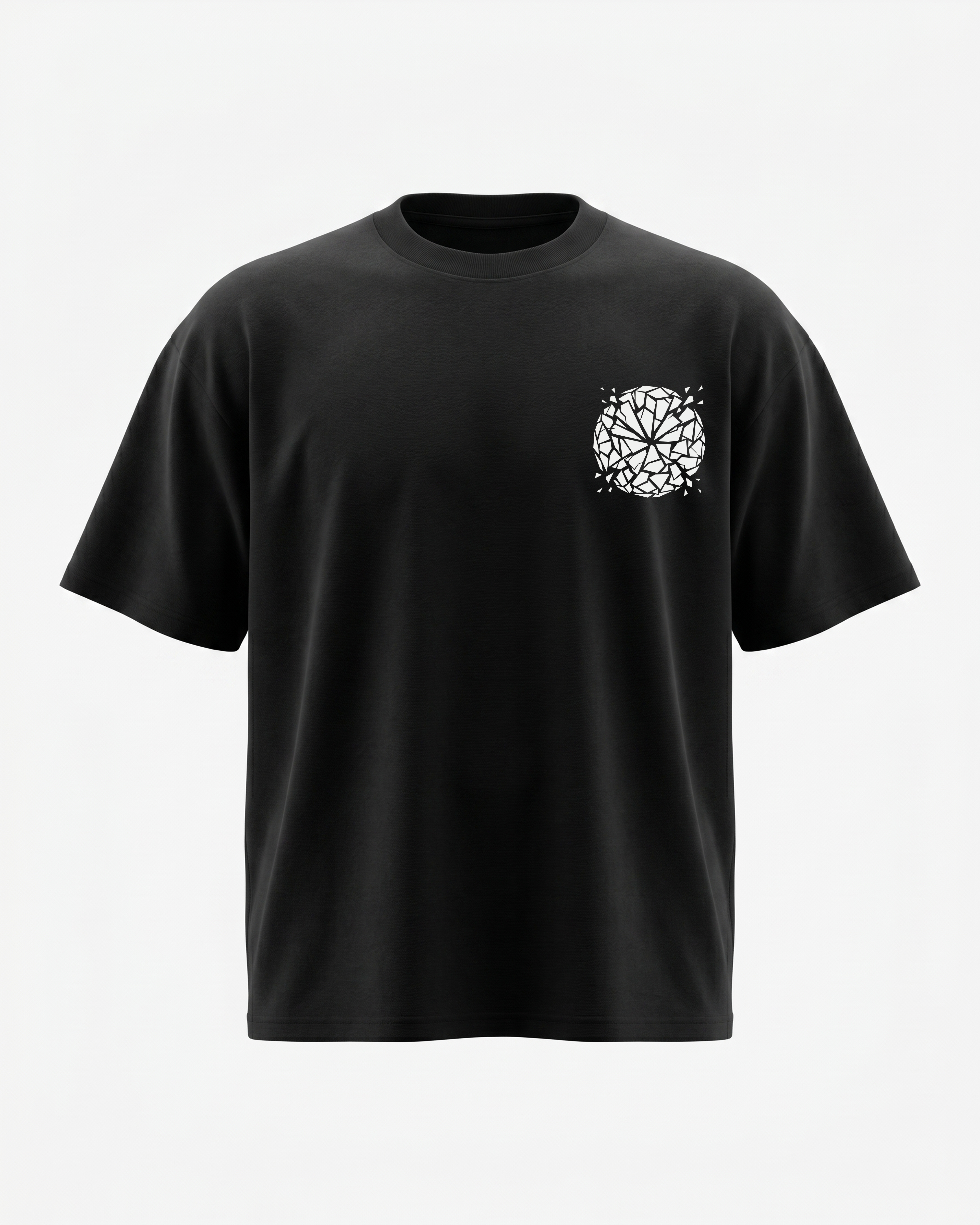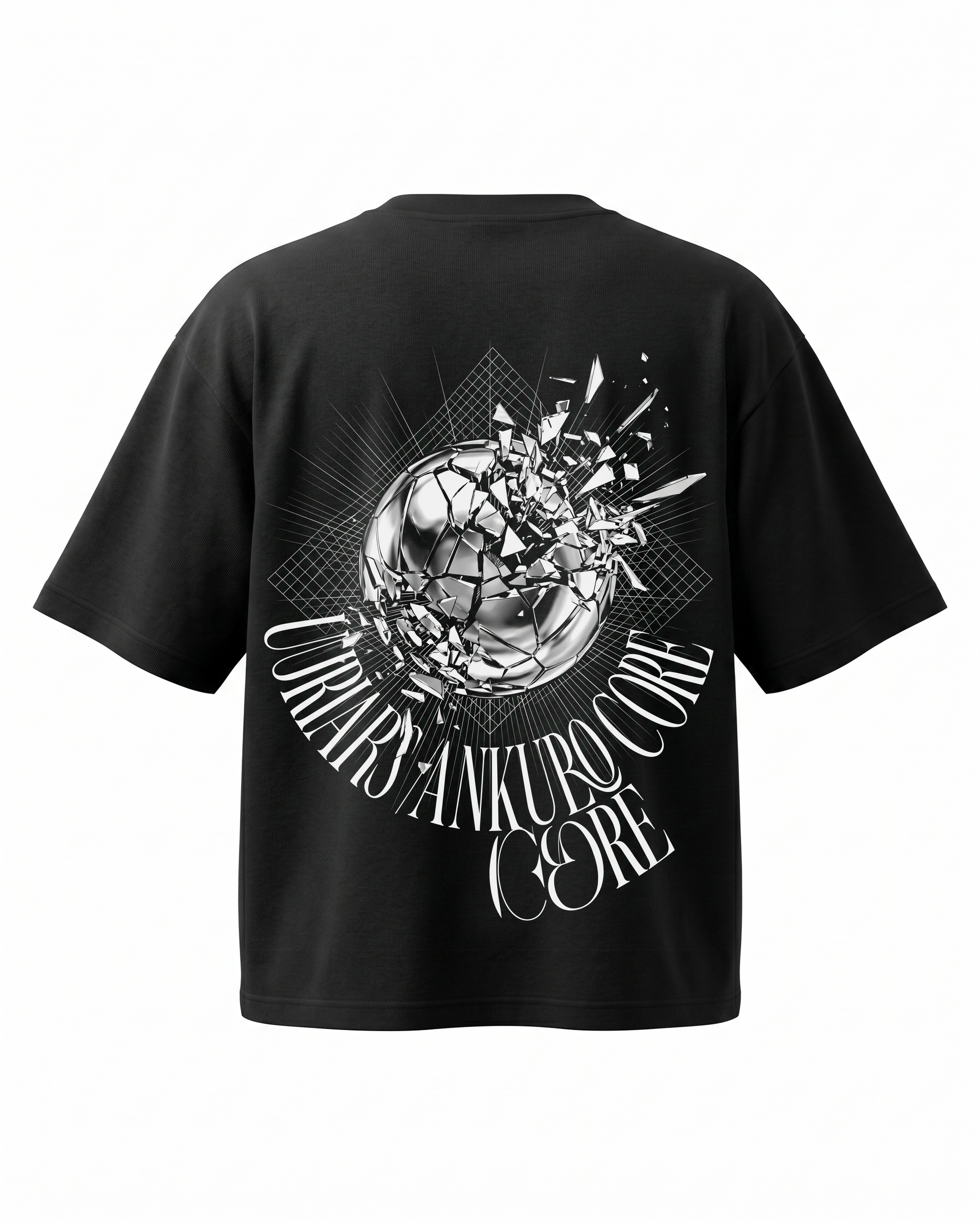 A hyper-detailed metallic orb and core nucleus breaking apart. 240GSM premium cotton, boxy oversized silhouette. DTG heat-cured print.