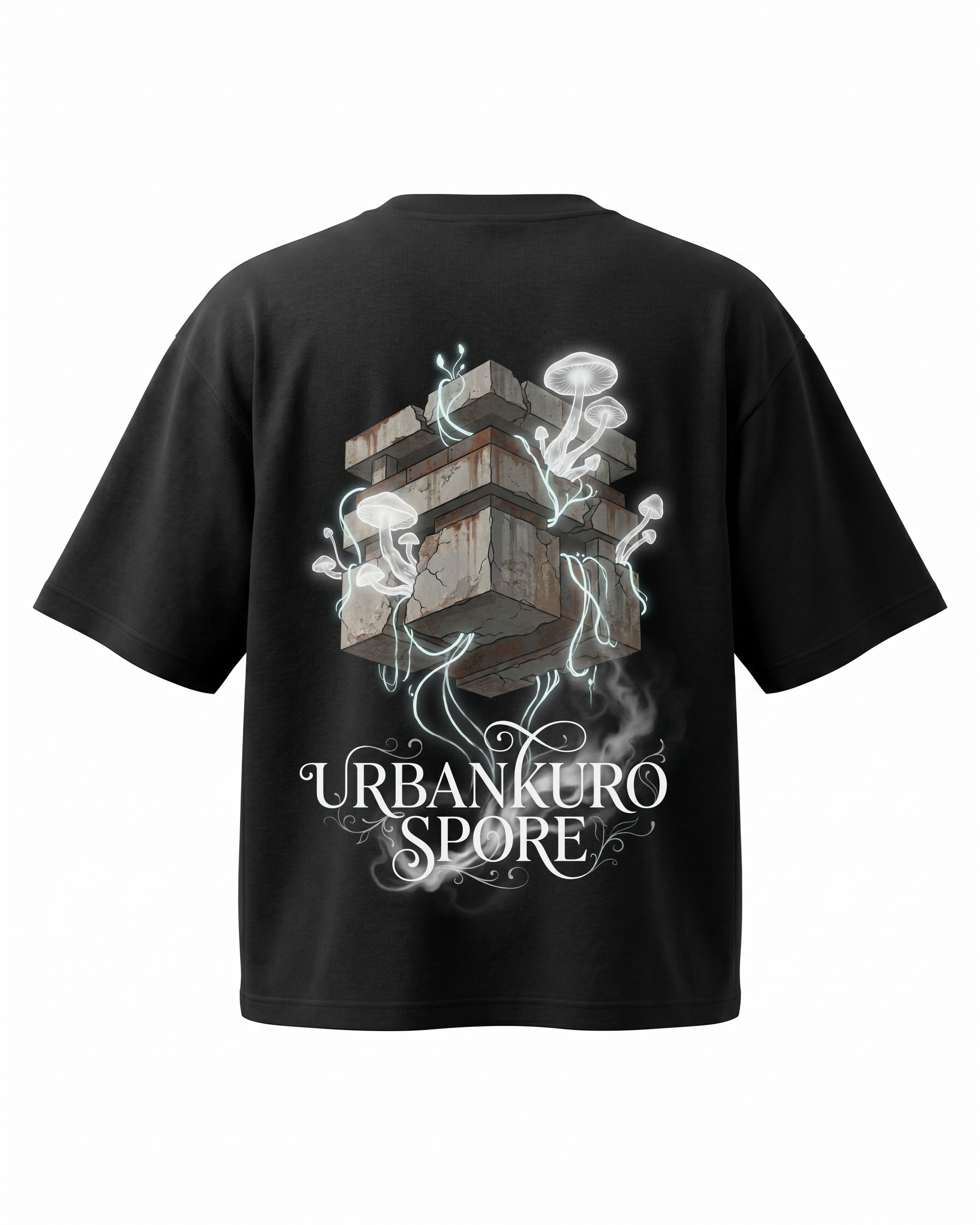 A surreal floating stone cube completely overtaken by hyper-detailed mushrooms and spores. 240GSM premium cotton, oversized boxy cut with reinforced ribbing.