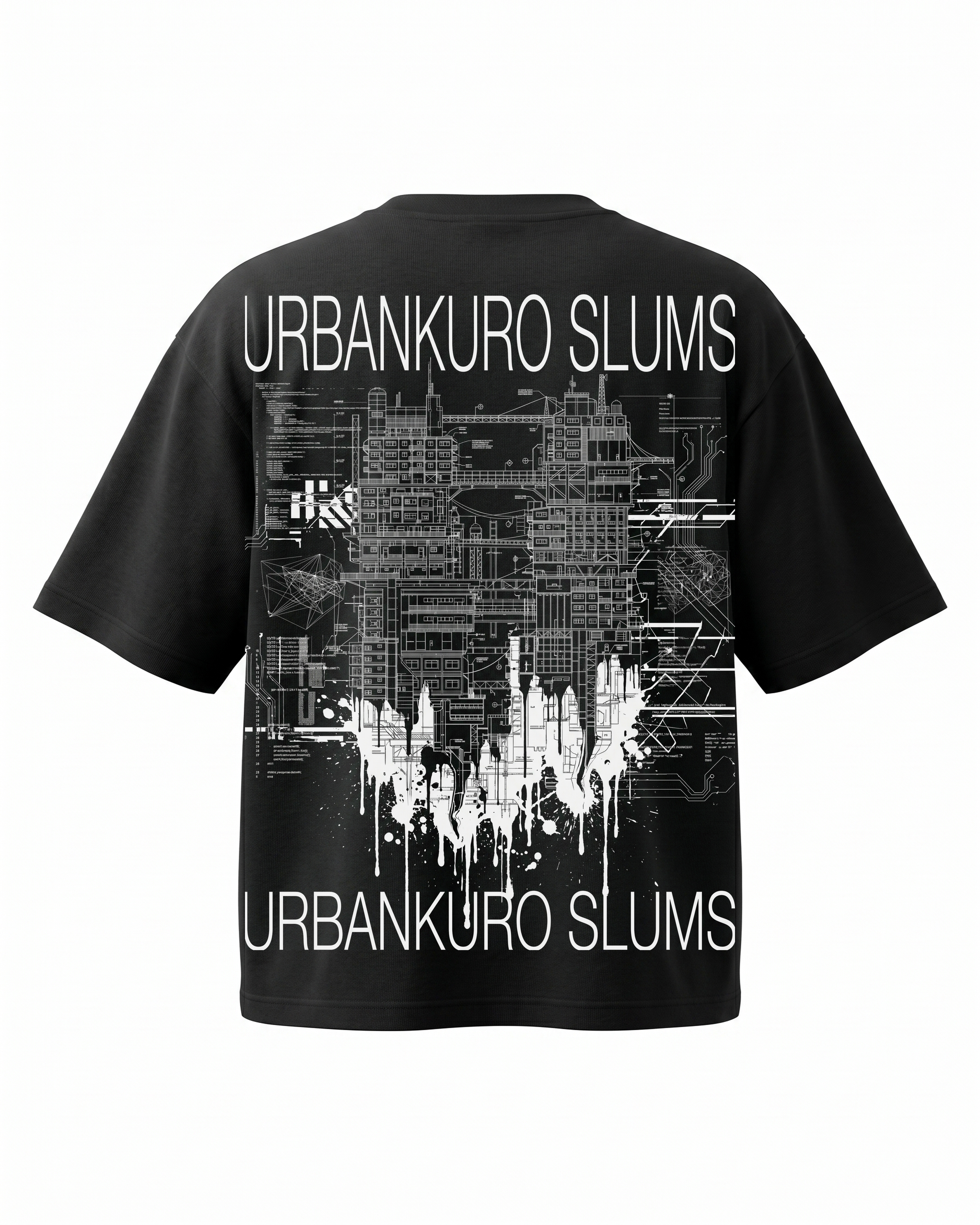 Extreme line-art architectural blueprint of a sprawling dystopian mega-city slum. 240GSM heavyweight oversized tee. The pinnacle architectural piece.